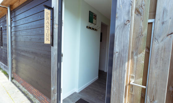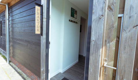 Praktijk bereikbaar; als je voor het huis staat rechts door de steeg en dan links